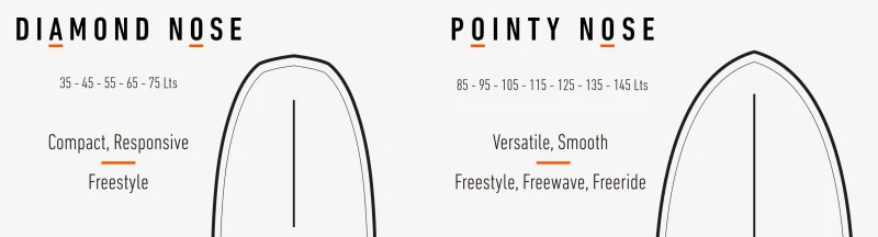 For volumes aimed at freeride and smoother wave performance, the boards feature a pointy nose and a more surf-inspired outline for effortless glide and stability.
